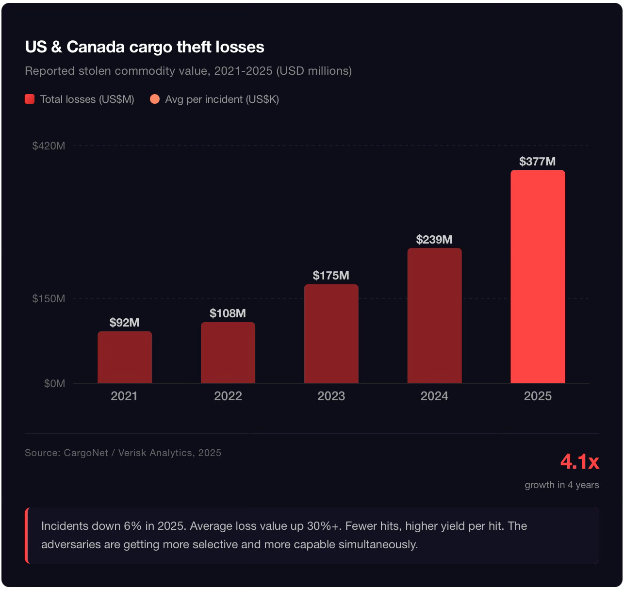 TAPA’s intelligence system recorded nearly 160,000 cargo-related crimes across 129 countries between 2022 and 2024. The total losses amount to billions of euros. In the US and Canada alone, estimated cargo theft losses hit $725 million in 2025. The average per-incident value rose over 30% year-on-year, even as total incidents dropped 6%.