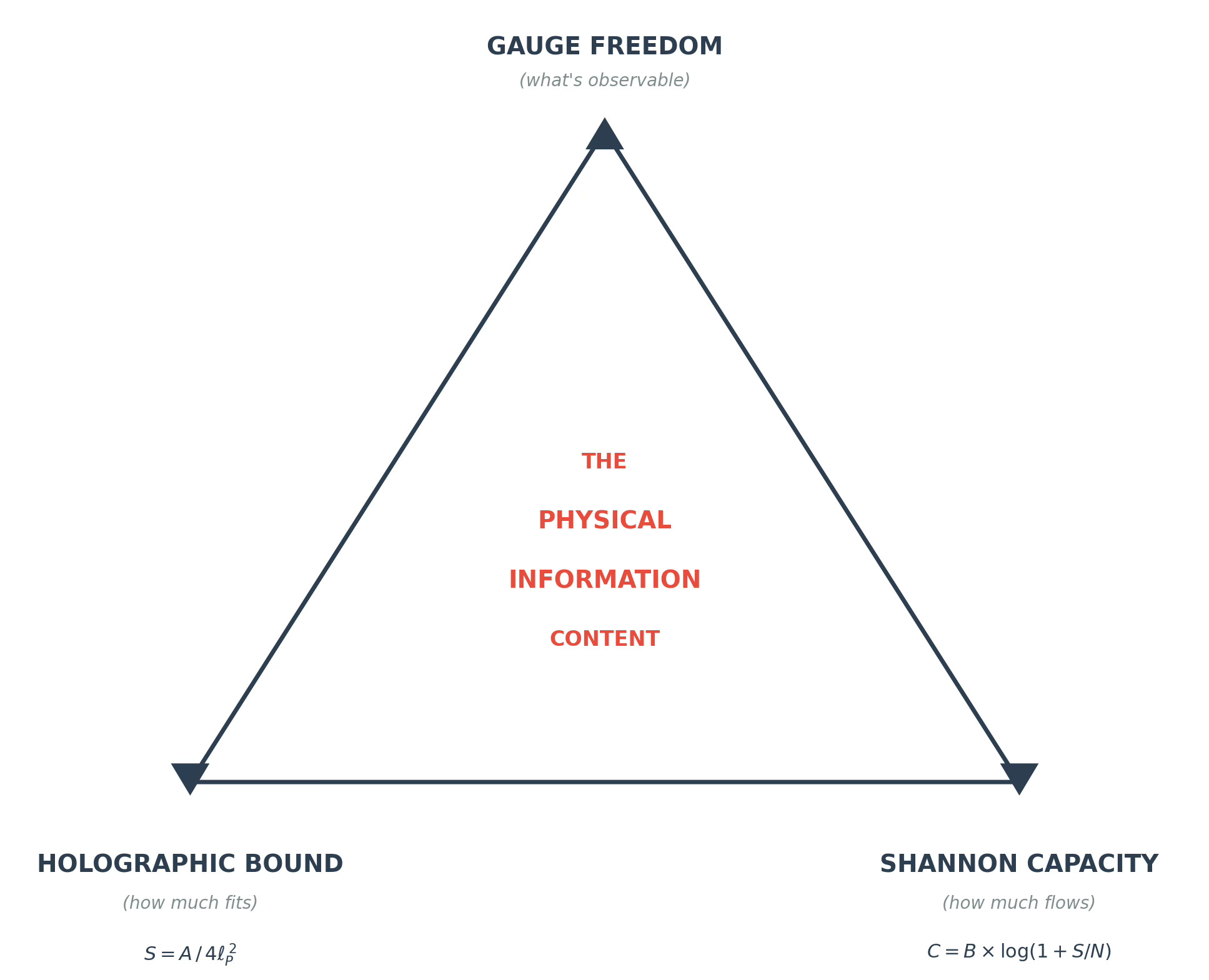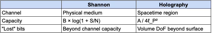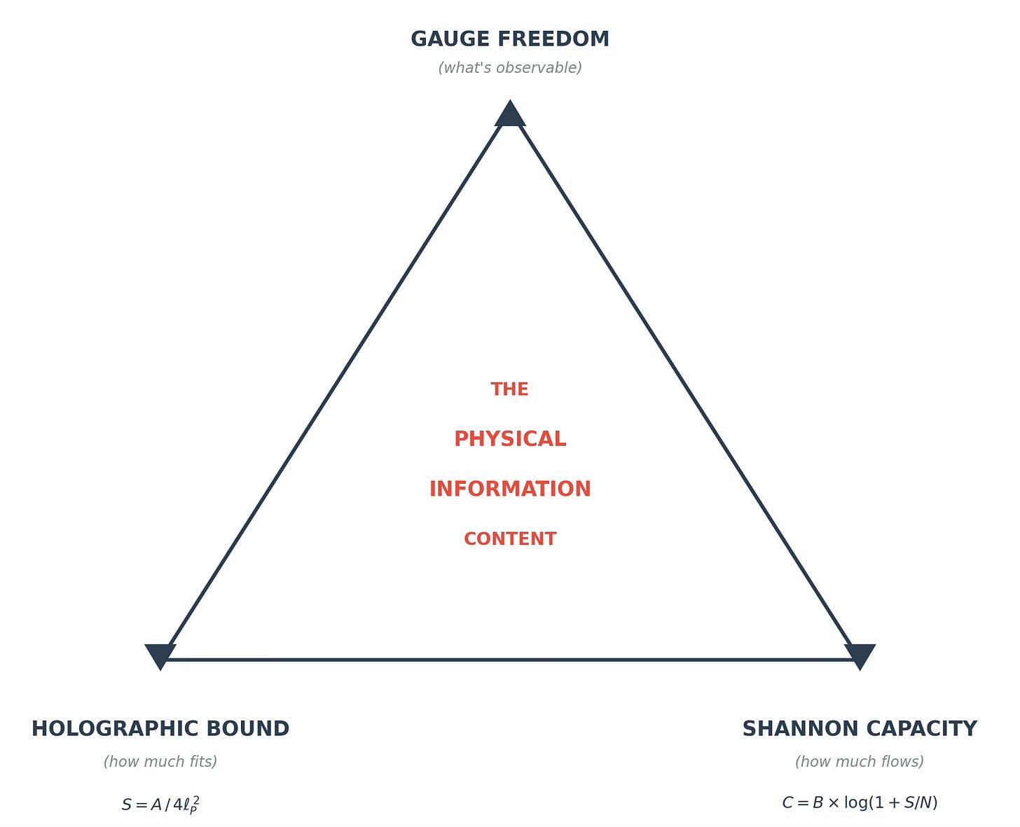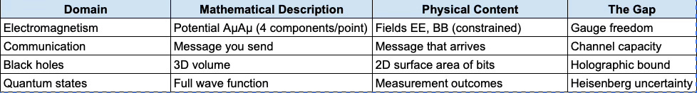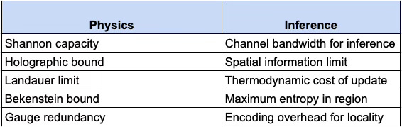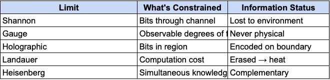 The constraints we observe such as gauge freedom, holographic bounds, channel capacity, they are are precisely what’s required for a self-consistent, locally-processable inference system. Therefore, gauge freedom isn’t a bug in our description. It’s the encoding structure that lets the universe compute locally while remaining globally coherent. The holographic bound isn’t a strange limit on black holes. It’s the statement that spatial regions are channels with finite capacity. Shannon’s theorem isn’t just about telephone wires anymore. It’s the universal constraint on any physical channel; including spacetime itself.
